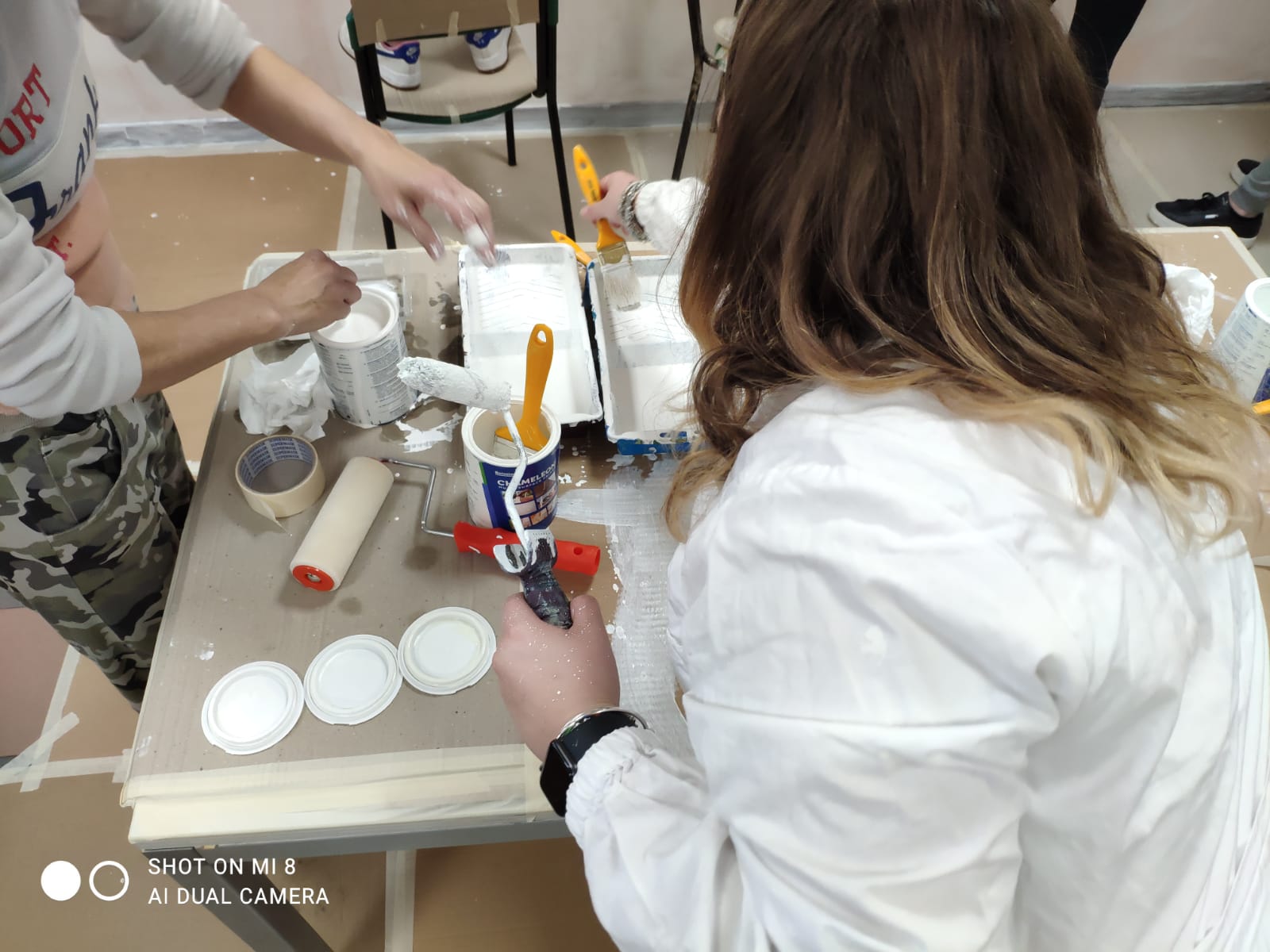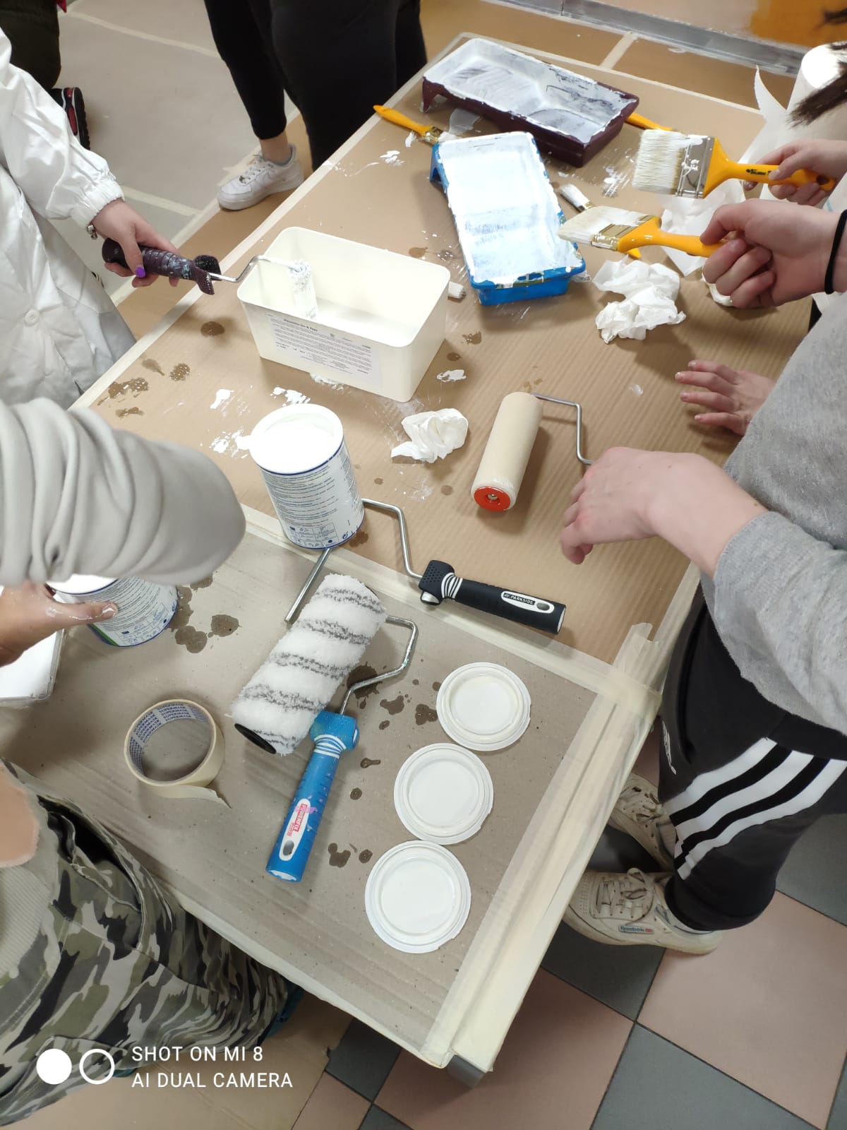 Vernice, pennelli, rulli e nastro adesivo: la novità esplode in una operosità dove la didattica smonta dalla cattedra, aggira il banco e si trasfigura in attività produttiva – poietica, come direbbe Aristotele.