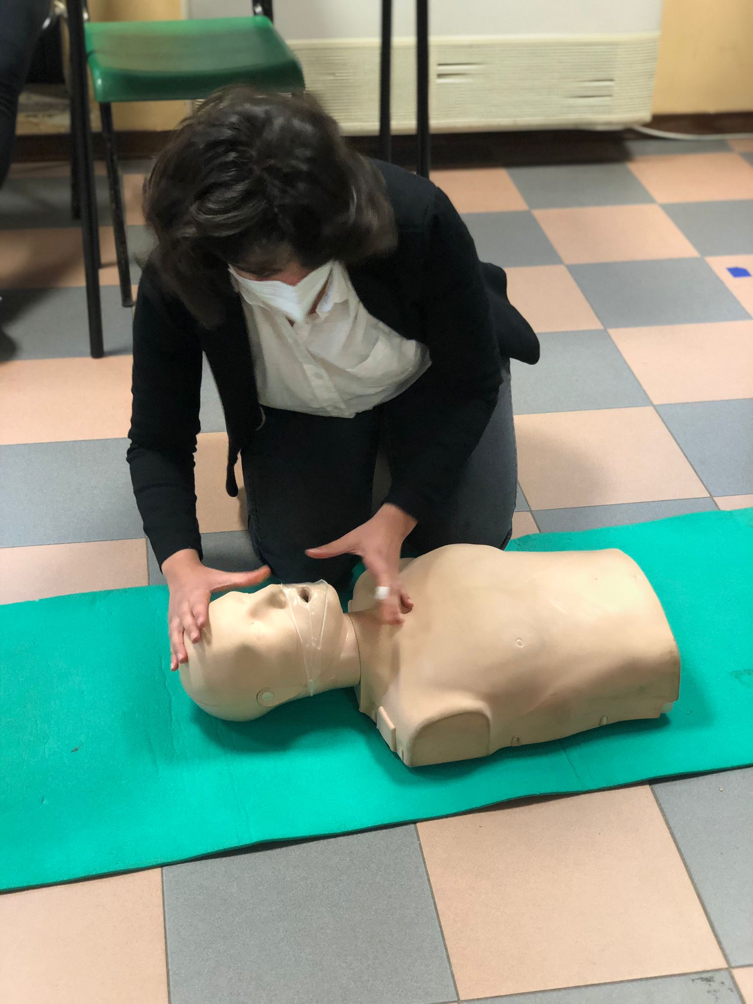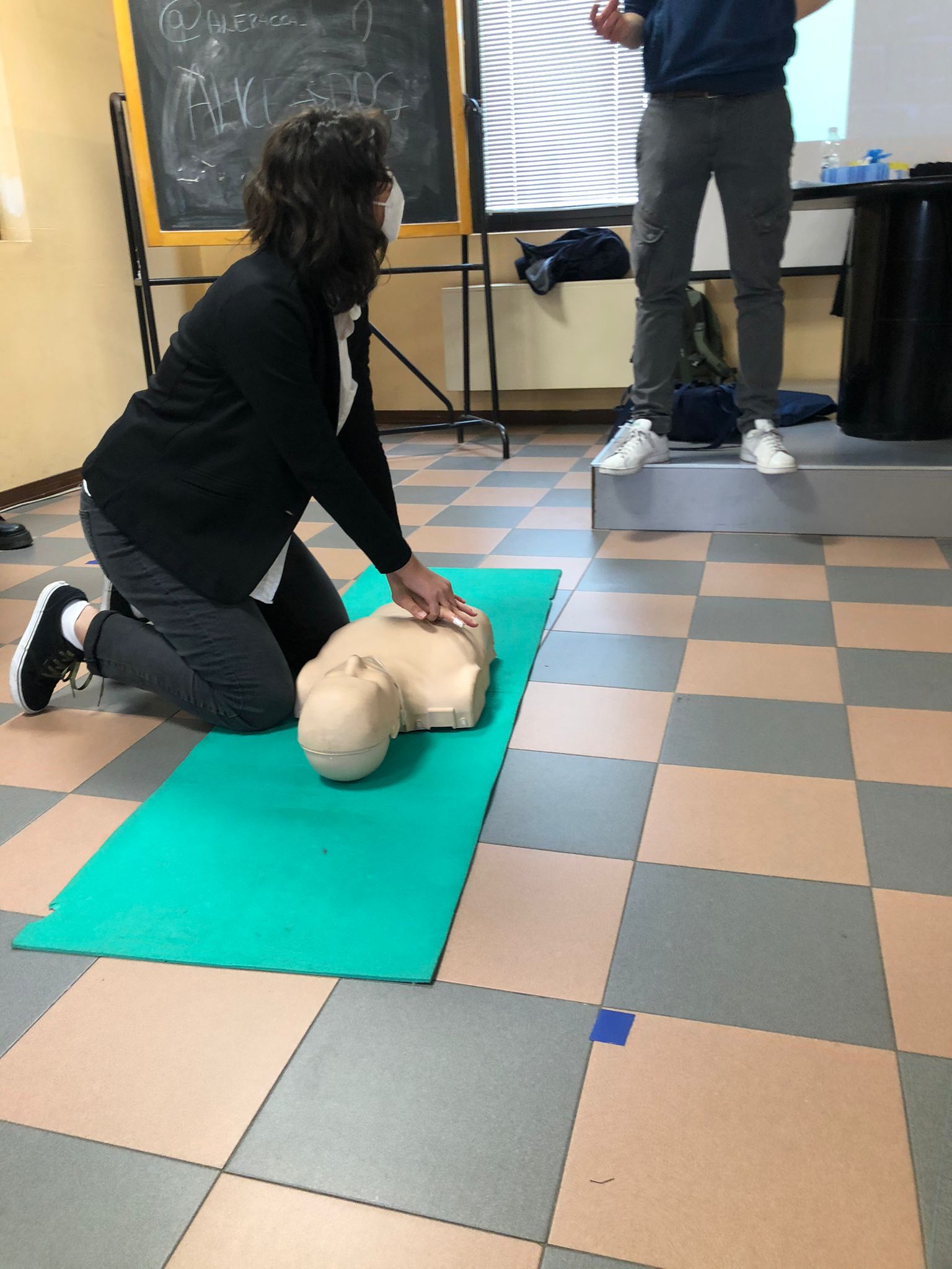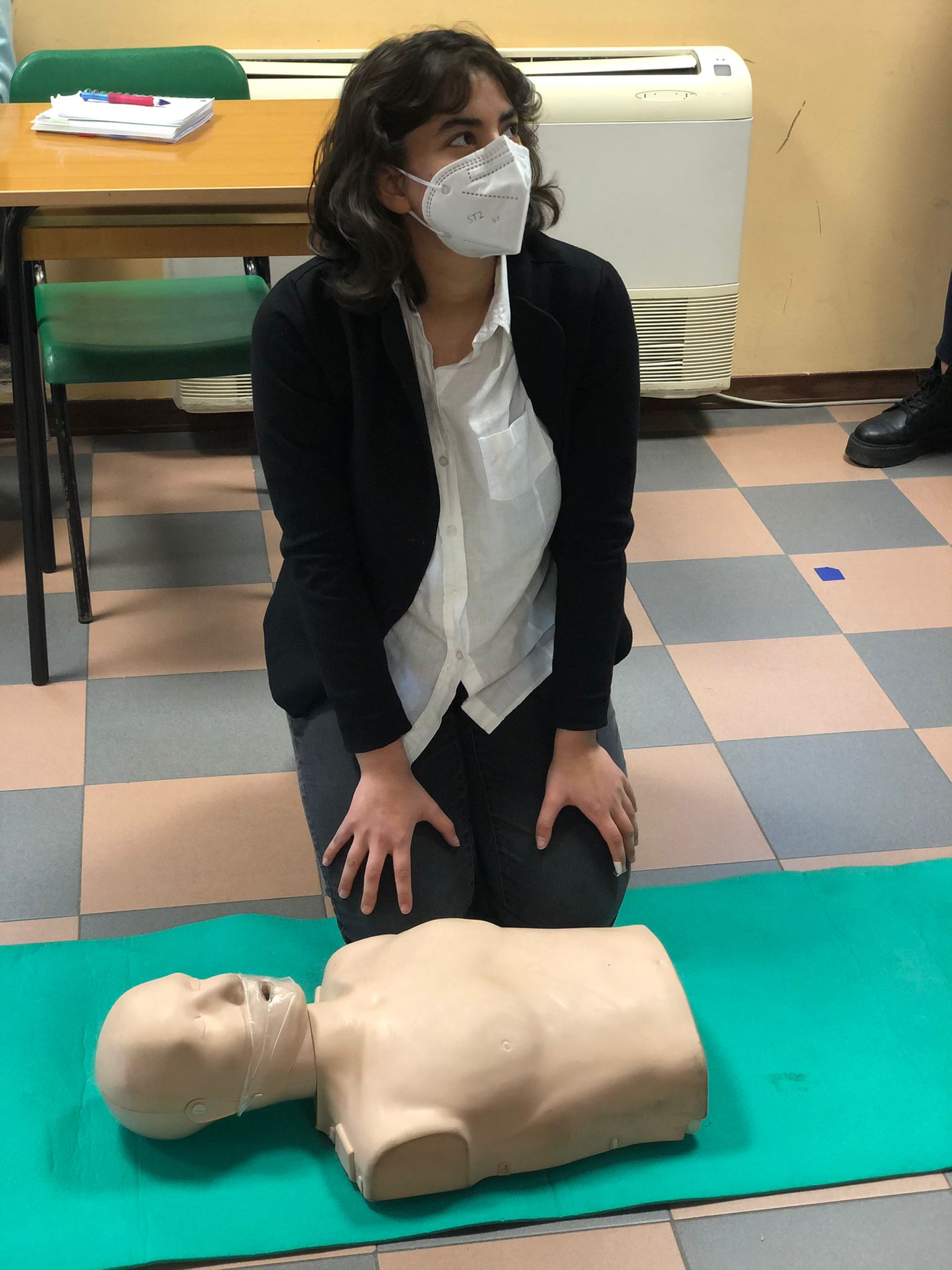 L’incontro è proseguito poi con la pratica: come fare il massaggio cardiaco. Mettersi nella posizione corretta e collocare le mani nel punto giusto, ora entra in gioco la musica. Sorpresa : Il ritmo della canzone “Stayin’ Alive” è quello da seguire per praticare correttamente il massaggio cardiaco, che alcuni alunni hanno avuto la possibilità di simulare su un manichino.