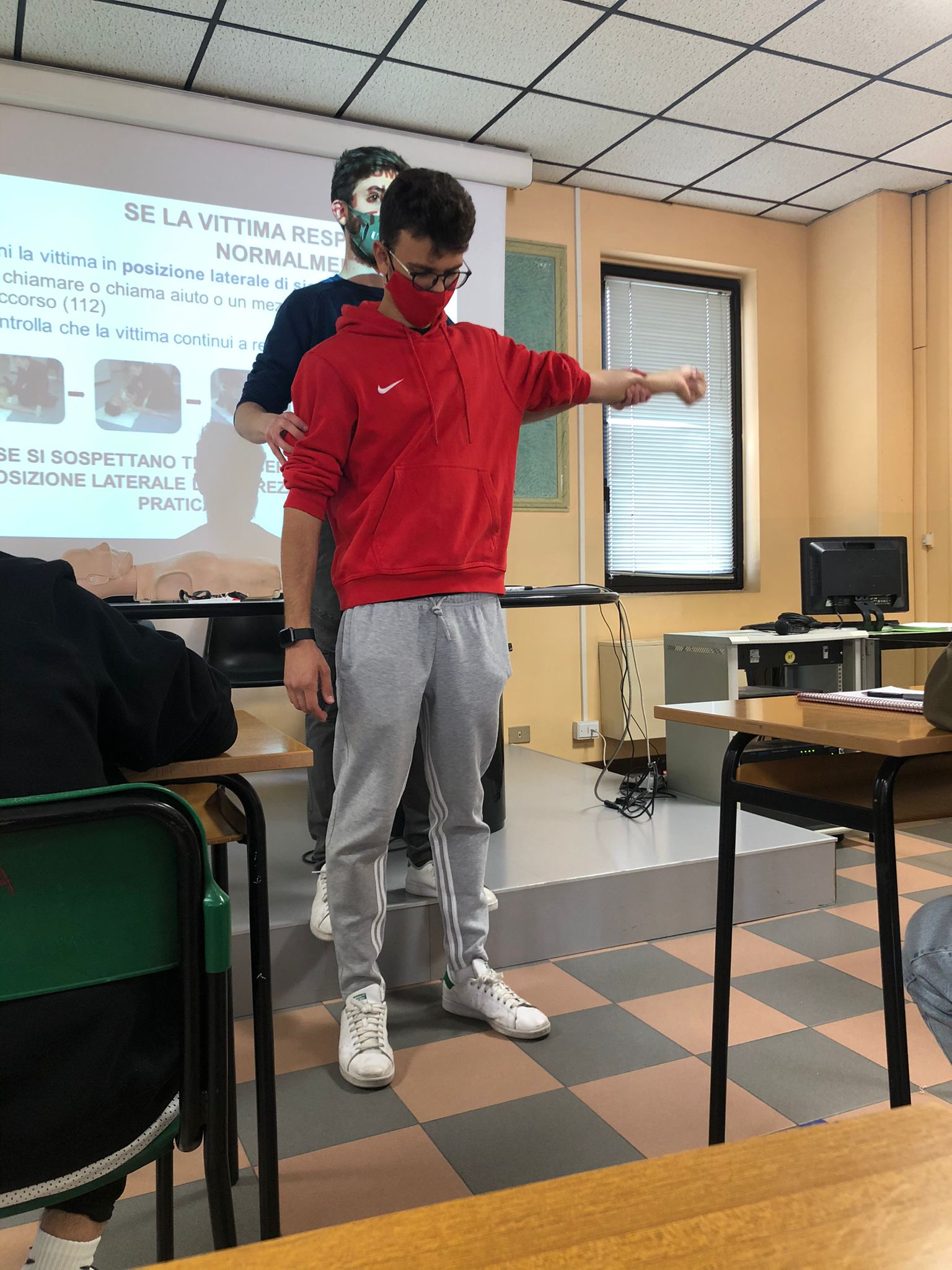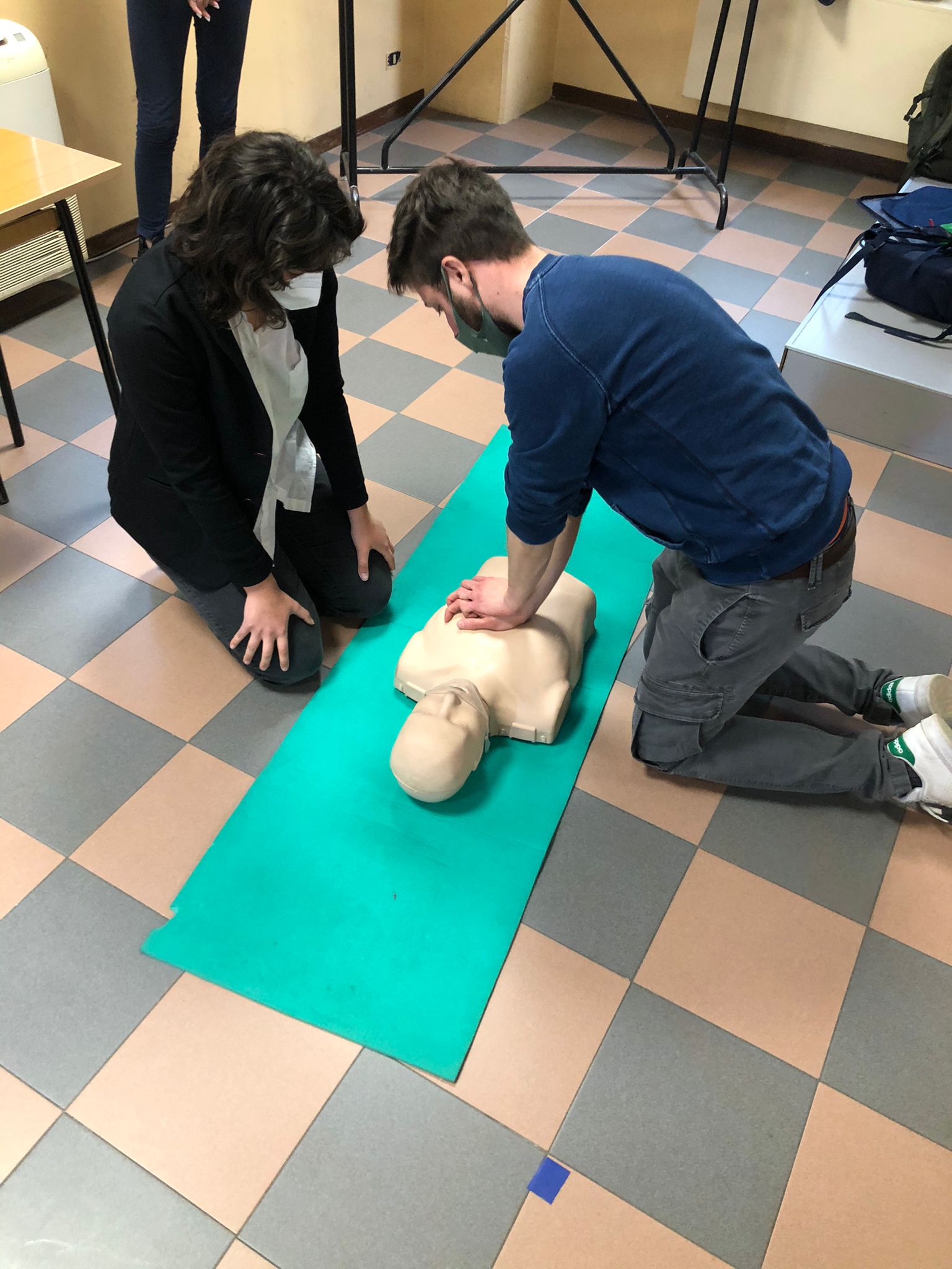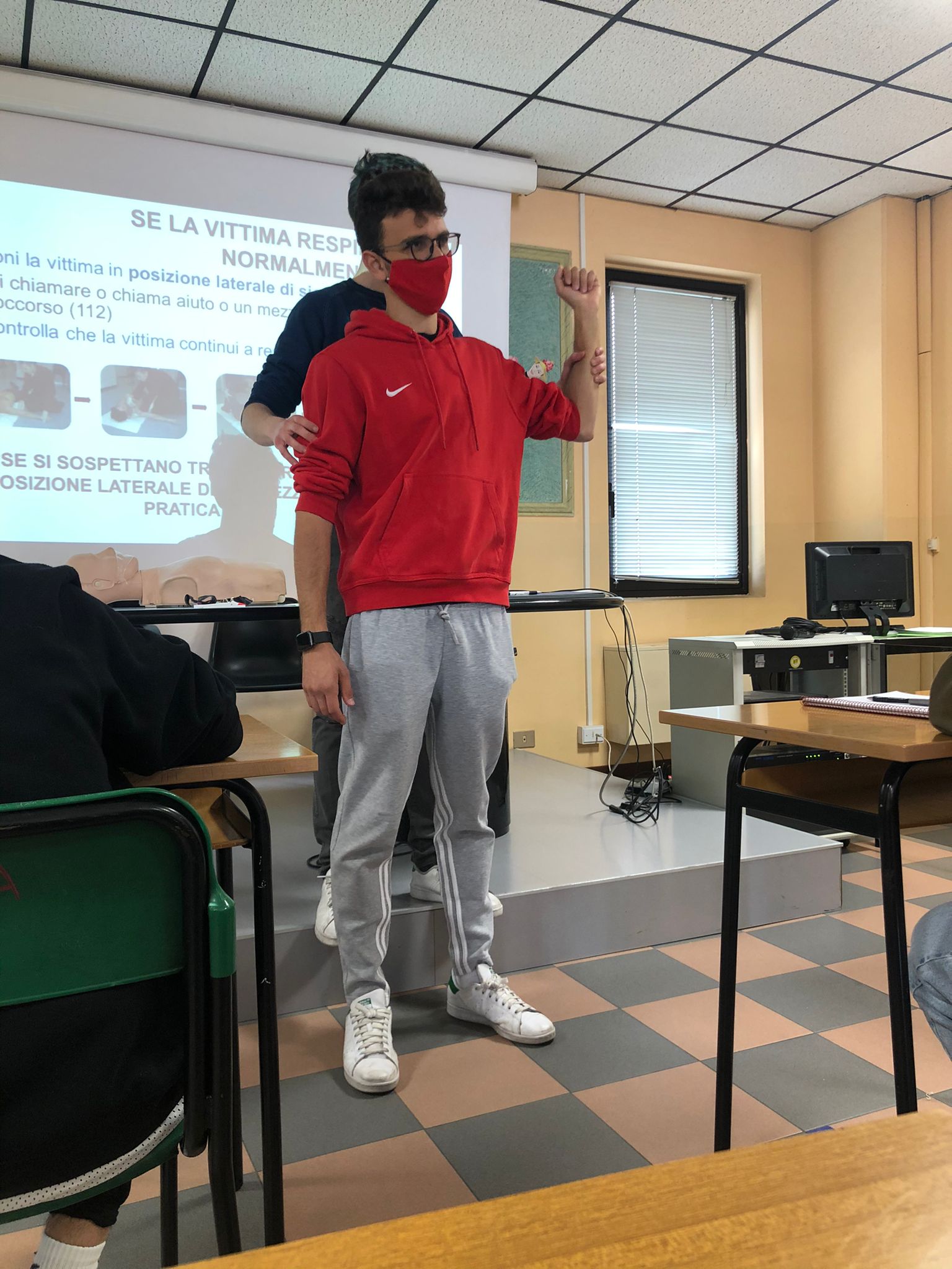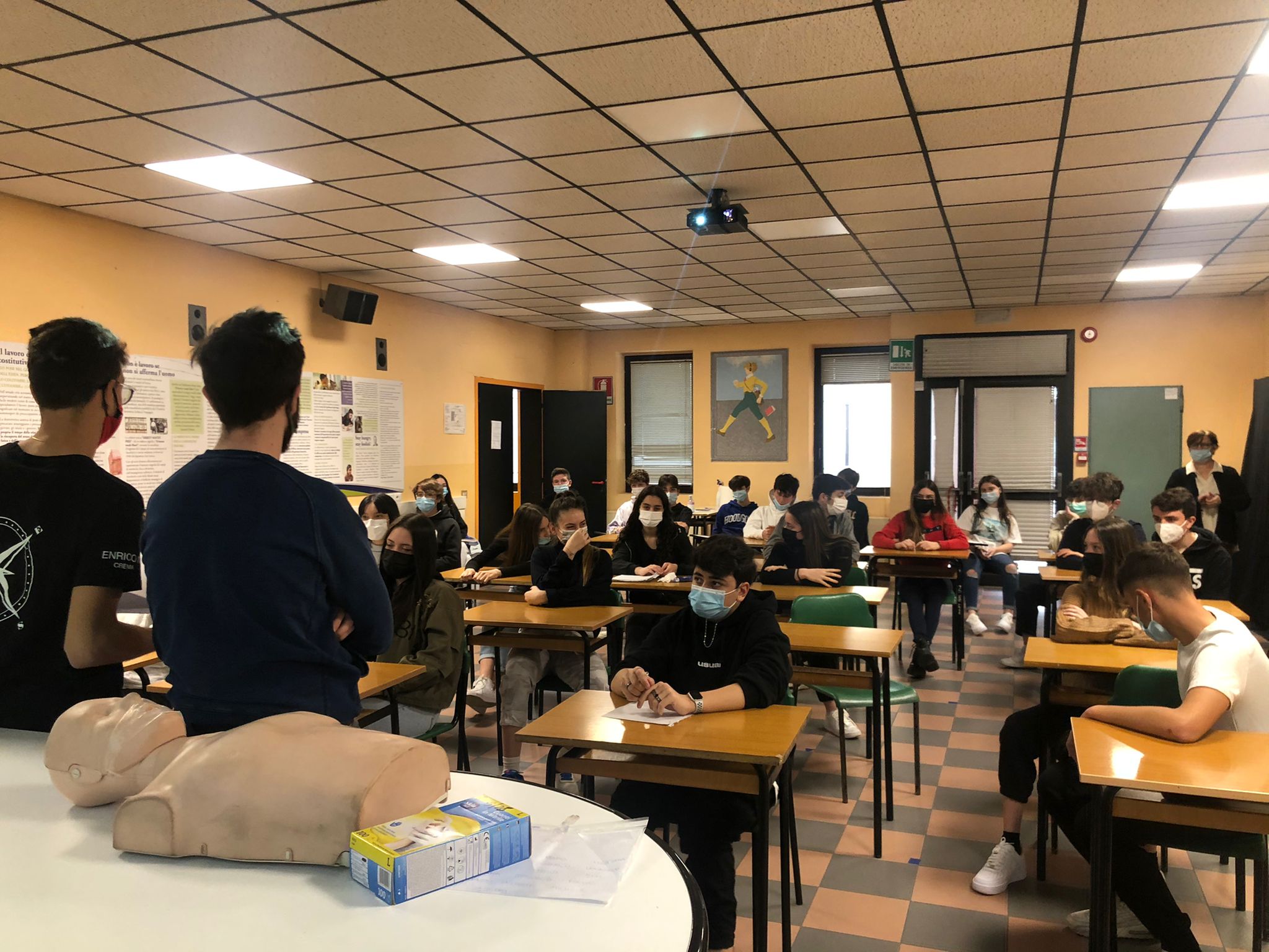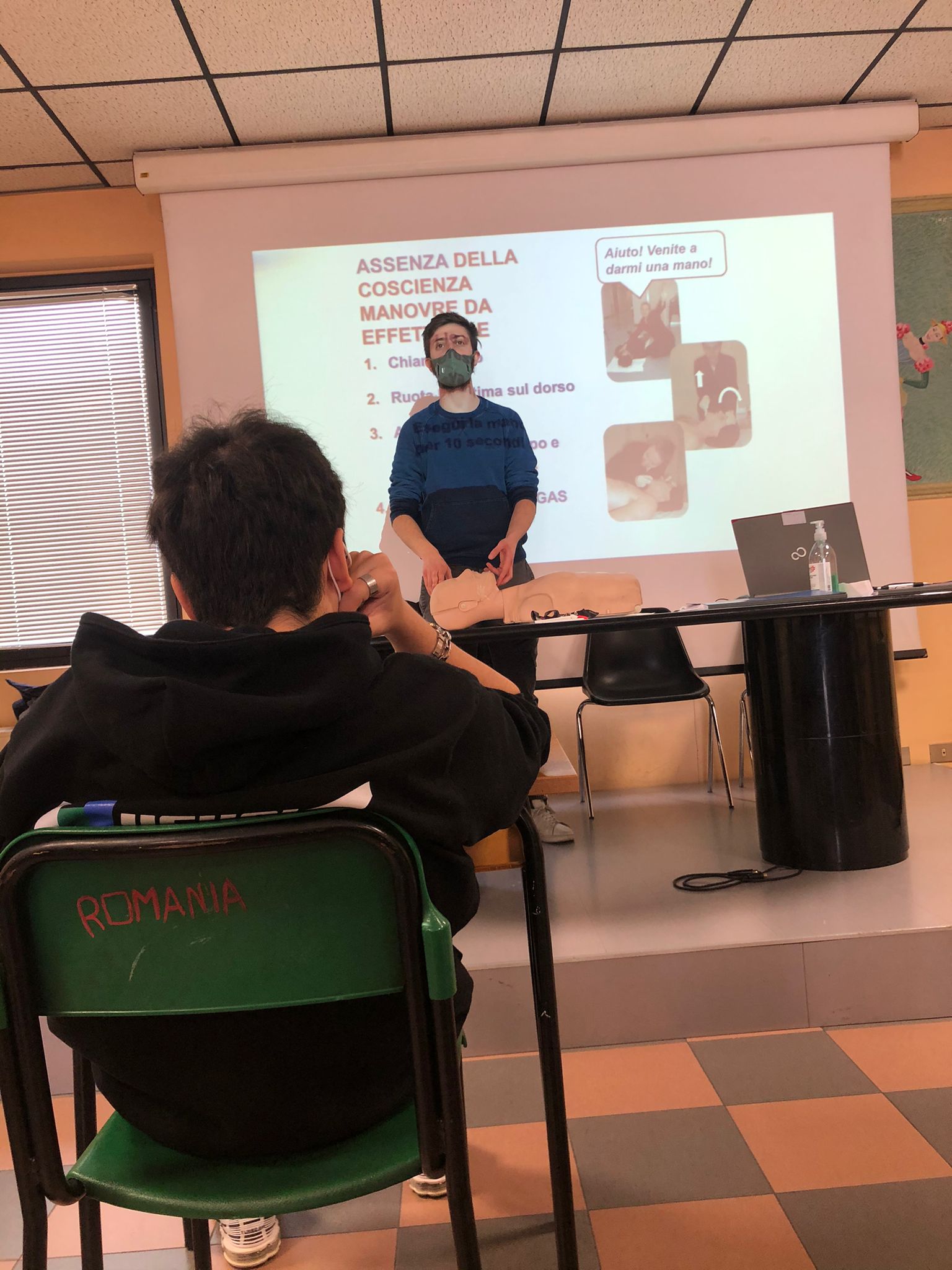 Tutti potremmo trovarci in una situazione di emergenza, ma quanti sarebbero davvero in grado di gestirla? È proprio su questo principio che si è basata la lezione, a sottolineare l’importanza dell’intervento delle persone “laiche” in attesa dell’arrivo di personale medico per preservare la vita in pericolo. A seguito dell’introduzione sulla priorità sanitaria, quindi sulla distinzione tra emergenze e urgenza, il Dottor Masseroli ha chiarito le casistiche di emergenze di fronte alle quali possiamo fare qualcosa: l’infarto e l’arresto cardiocircolatorio. Dopo aver messo in sicurezza l’ambiente e valutato le condizioni della persona da soccorrere, il primo passo è sempre contattare i soccorsi (il Numero Unico di Emergenza, il 112). A questo punto, noi abbiamo la responsabilità di rimanere insieme alla persona che ha bisogno e praticarle, se necessario, il massaggio cardiaco o metterla nella posizione laterale di sicurezza.