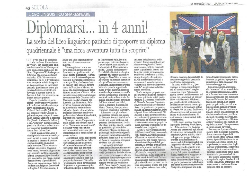 Sul giornale Diocesano il Liceo Linguistico quadriennale Shakespeare ha raccontato la ricchezza di vita di questa prima parte dell’anno scolastico. Nonostante le difficoltà affrontate da studenti e insegnanti tra didattica a distanza e in presenza sono state tante le occasioni per tener vivo il desiderio di conoscenza e compagnia.