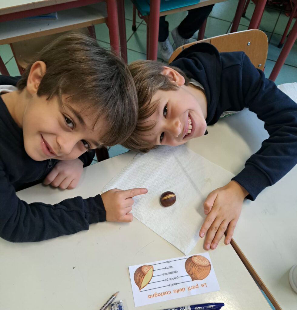 E non poteva mancare la castagna in questa splendida stagione: ne raccogliamo tante, quelle ai giardini e quelle che in un bel giorno di fine ottobre ti portano a scuola quei bambini che hanno fatto una castagnata in famiglia: ora scoprire quali nomi nuovi fanno parte della castagna, osservarla e comprenderla meglio sorge come domanda dai bambini stessi e allora si riparte e nuove attività prendono vita. Impariamo la nomenclatura, scoprendo qualche gioco di parole da fare a mamma e papà, una nuova trasformazione dalla castagna alla farina che da essa si può ricavare e per concludere una gustosa merenda con le caldarroste e il castagnaccio cucinati direttamente in classe. Sono percorsi che nascono da obiettivi precisi che possiamo raggiungere e sviluppare proprio a partire dalla realtà che ci circonda, dalle domande dei bambini, dall’entusiasmo che nasce in loro, ma anche in noi maestre, nella scoperta e riscoperta di una ricchezza e di una bellezza che, se ci educhiamo a conoscere e riconoscere, sa essere sempre un tesoro prezioso.