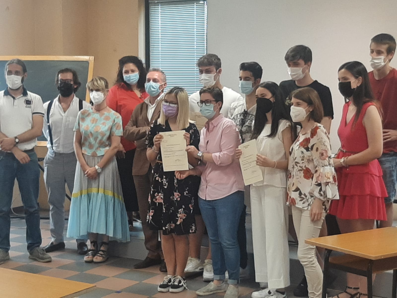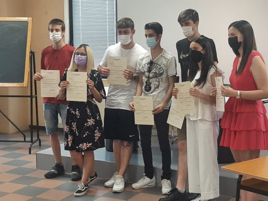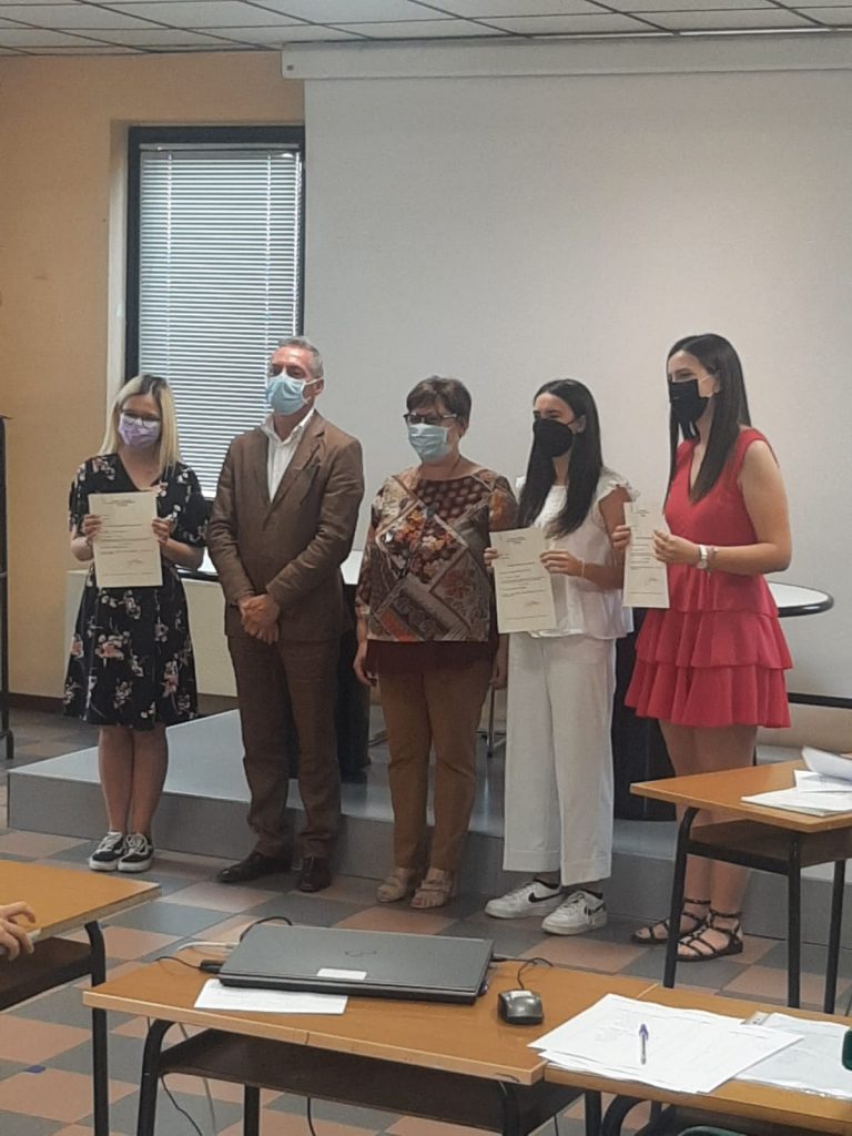 Giovedì 17 alle 13, in un’aula magna poco gremita a causa dell’emergenza sanitaria, si è svolta la cerimonia della consegna dei diplomi per gli studenti di quinta che in tempi record hanno concluso l’esame di stato. Alla presenza del Presidente, prof. Claudio Venturelli, della preside e della commissione esaminatrice, i “maturati”, chiamati ad uno ad uno, hanno ricevuto l’attestato con la valutazione dell’esame e le congratulazioni di insegnanti e compagni. Tutti soddisfatti, soprattutto le tre ragazze che hanno ottenuto la lode, coronamento di un cammino fatto di costante impegno e passione.